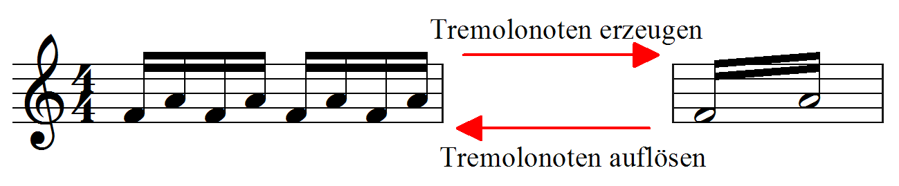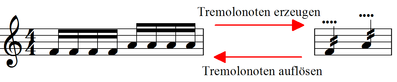 Gentagne nodegrupper kan nu omdannes til tremolo-noder via funktionen: Valg → Andre funktioner → Tremolo → Opret tremolo-noder. Omvendt kan tremolo-noder opløses til enkeltnoder via: Valg → Andre funktioner → Tremolo → Opløs tremolo-noder til enkeltnoder.