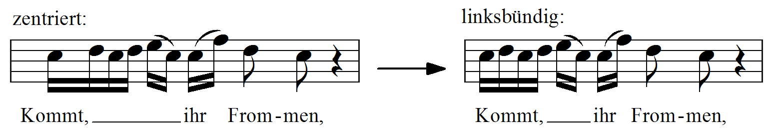 Venstrestillet justering af en sangstavelse er nyttig, når flere noder synges på samme stavelse, som i dette eksempel: