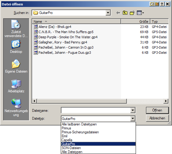 PriMus accepterer følgende filendelser som gyldige GuitarPro-filer: gpx, gp6, gp5, gp4, gp3, gtp.